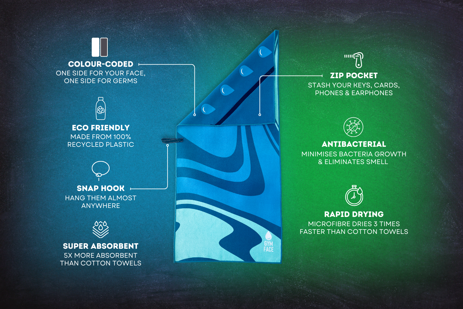 Colour-coded Gym Face towels designed with one side for your face and one side for everything else - preventing you from wiping other people’s germs on your face.